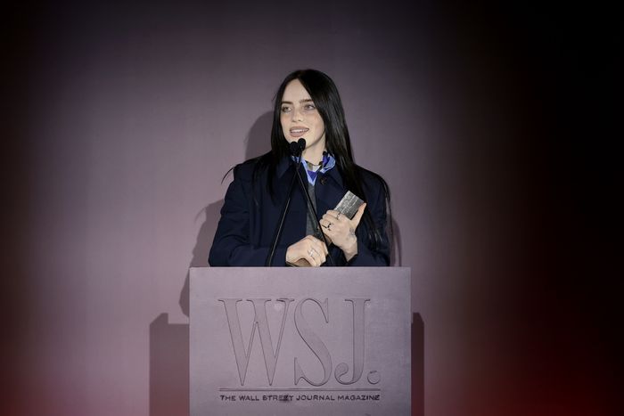 “I love you all,” Billie Eilish told a big group of people, including Mark Zuckerberg, Hailey Bieber, and Chris Rock, at The Wall Street Journal’s Innovator Awards on October 29, “but there’s a few people in here that have a lot more money than me.” She sang the last word of her sentence and flashed the audience a toothy smile. “If you’re a billionaire, why are you a billionaire? No hate, but yeah, give your money away, shorties. Love you guys.”