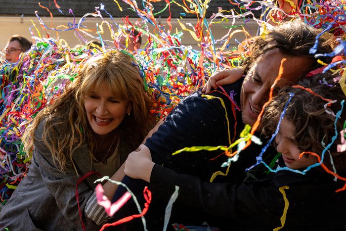 The adventures of a newly single middle-aged man on the New York comedy scene would be pretty thin as far as subject matter goes, even when that man is played by Arnett, our most divorced comedian (Arnett co-wrote the screenplay). But Is This Thing On? is the third film to be directed by Bradley Cooper, who has a real flair for domestic drama. Inspired by the life of British comedian John Bishop, who didn’t begin pursuing stand-up full time until he was in his 40s, Is This Thing On? is more interested in Alex’s relationship with his wife, Tess (Laura Dern), a former Olympic volleyball player turned stay-at-home mom, than it is his career prospects. The Novaks’ marriage was on the rocks for a long time before they call it quits in an early scene, the split affable enough that they’re able to go to a dinner party afterward and pass themselves off as still together, only parting ways when Tess gets back on the train to Westchester. Though Tess and Alex agree that they should be apart, they struggle to articulate what happened between them, even as they assure their two ten-year-old sons that everything’s fine.
