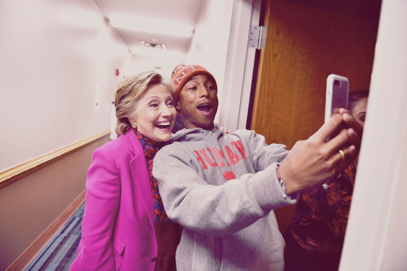 Hillary Clinton poses with Pharrell Williams for a selfie backstage before a campaign rally in Raleigh, North Carolina, on November 3, 2016.